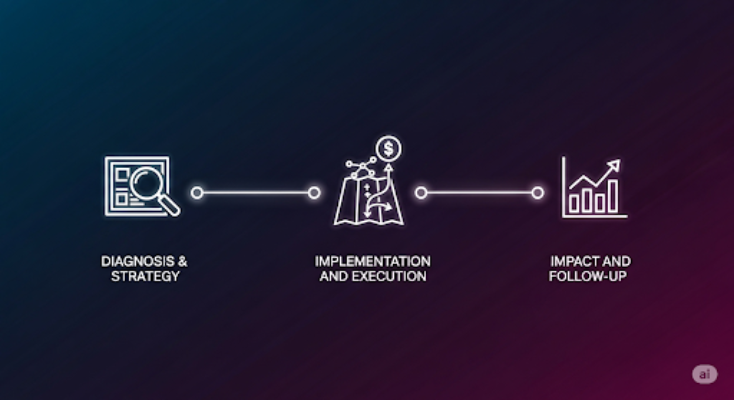 - We rigorously evaluate your business's readiness to scale, identifying core challenges and growth opportunities. Through deep analysis, we define a clear scope and a strategic plan to achieve your desired outcomes.